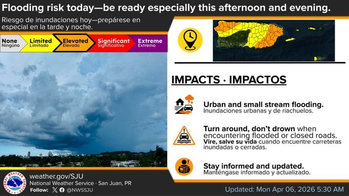 Riesgo de inundaciones aumenta esta semana, especialmente a mitad de semana. Las lluvias y tormentas de tarde y noche pueden causar inundaciones en calles y quebradas pequeñas, con posibilidad de inundaciones repentinas.