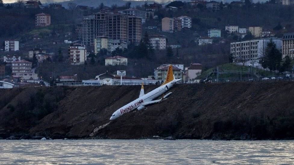 La aeronave con 168 personas a bordo se salió de la pista al aterrizar en Trabzon y quedó suspendido en un pequeño acantilado junto a las aguas del Mar Negro.