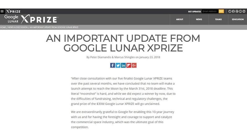 "Después de una estrecha consulta, realizada en los últimos meses, con nuestros cinco equipos finalistas de Google Lunar XPRIZE, hemos concluido que ningún equipo intentará llevar a cabo un lanzamiento para llegar a la Luna el 31 de marzo de 2018 (día que se estableció como fecha límite) ", indicó la organización el martes en un comunicado firmado por sus directores, Peter Diamandis y Marcus Shingles.