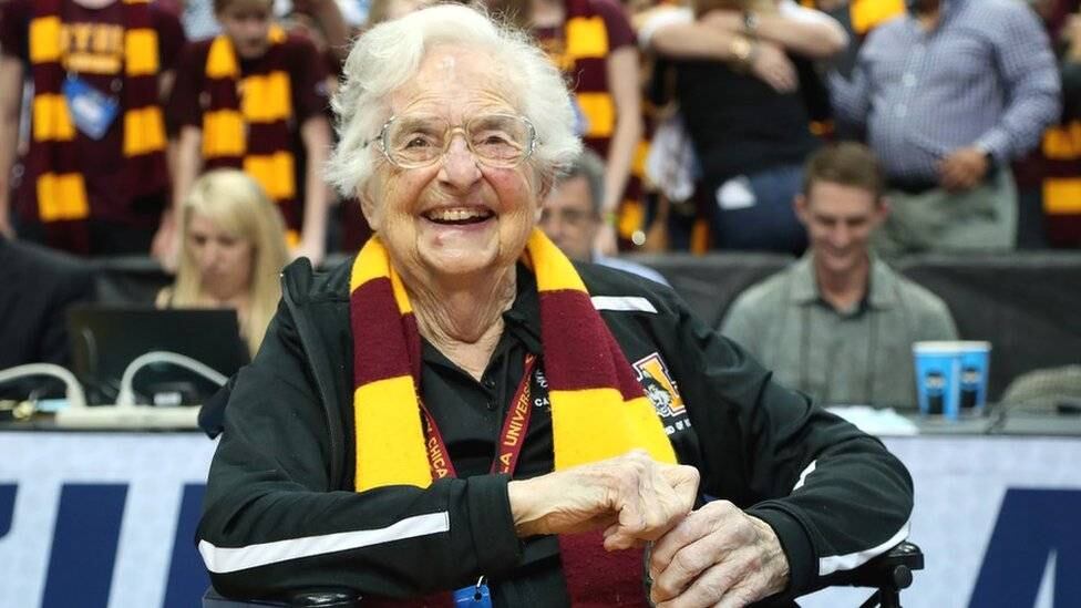 En su silla de ruedas, con una frondosa mata de pelo blanco, una cara poblada de arrugas y la pasión por su equipo intacta, la hermana Jean Dolores-Schmidt se convirtió a los 98 años en la sensación del deporte en Estados Unidos.