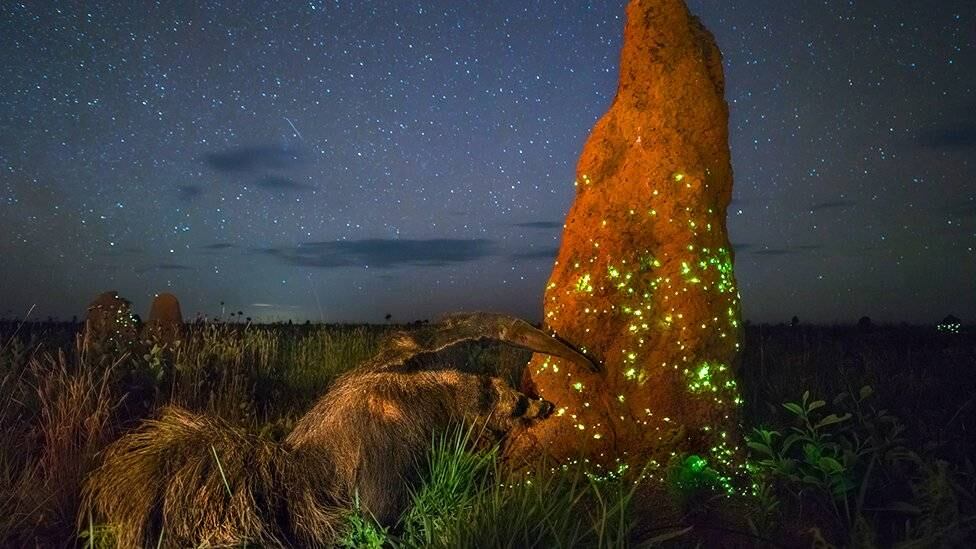La foto, conocida como "El invasor nocturno", muestra a un oso hormiguero acercándose a un montículo de termitas en una reserva natural en Brasil.