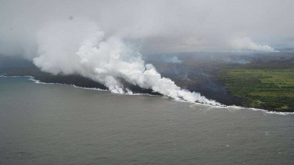 El gobierno local dice que dos flujos de lava llegaron al océano Pacífico, creando nubes espesas conocidas en inglés como "laze" por la combinación de las palabras lava y haze (neblina).
