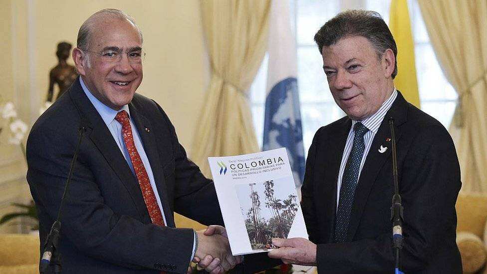 El mandatario colombiano festejaba que su país se convertirá en el miembro número 37 de este selecto club de países "ricos", de los cuales hasta ahora solo dos eran latinoamericanos: México y Chile.