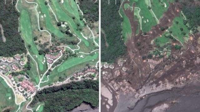 En estas otras imágenes satelitales, distribuidas por la agencia Reuters, se ve cómo el flujo piroclástico cubrió gran parte de las casas de la zona de Los Lotes, así como la vegetación y la carretera.