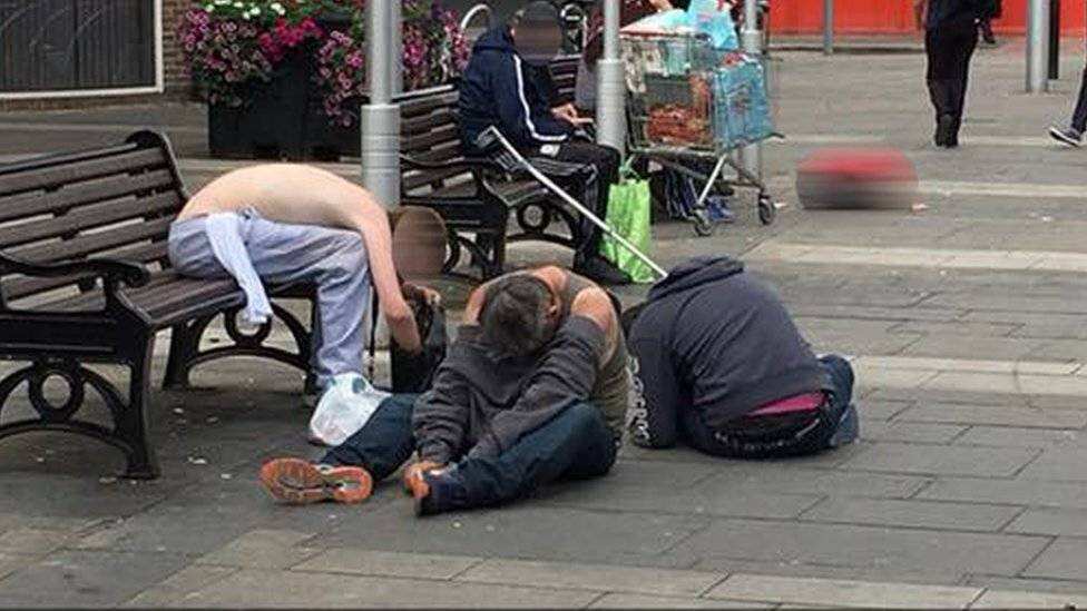 Una imagen que corrió por las redes sociales alarmó a Reino Unido esta semana: la de un niño jugando a pocos metros de tres hombres que apenas podían mantenerse sentados.
