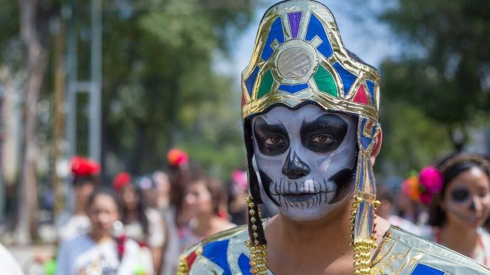En este retrato se ve a "un joven disfrazado de faraón con la cara pintada de catrín que desfila por las calles de Guadalajara", nos dijo en su correo a BBC News Mundo.