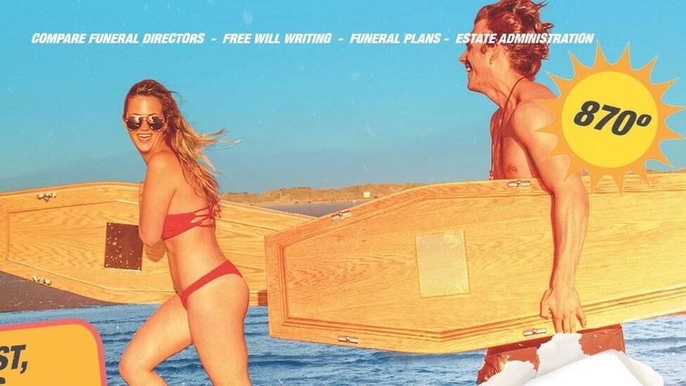 En uno de los anuncios se ve a dos jóvenes corriendo por la playa llevando ataúdes en vez de tablas de surf y se bromea con las "temperaturas abrasadoras" y la cremación.