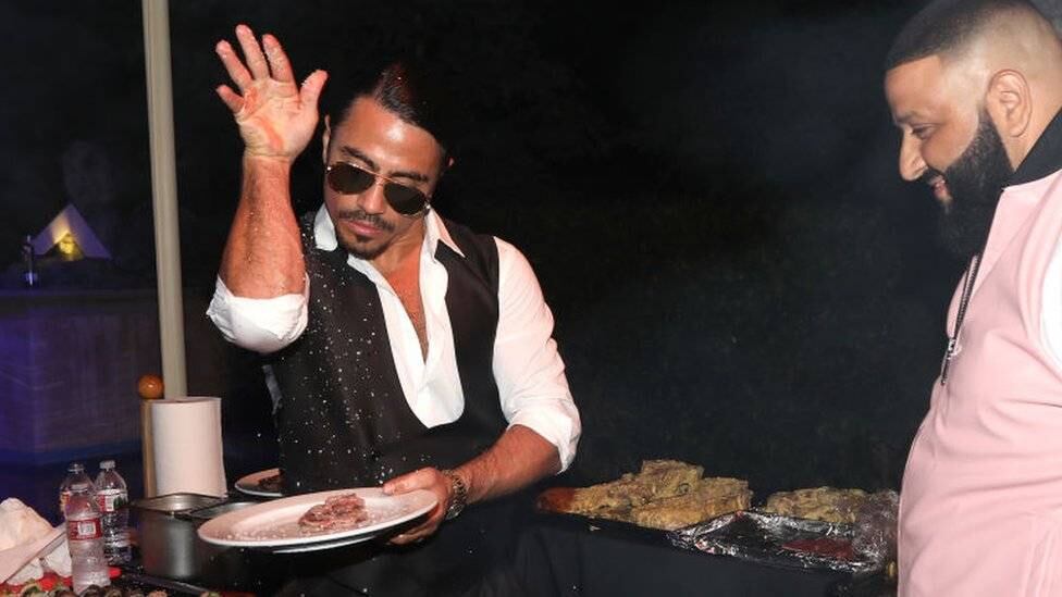Fue entonces cuando un video publicado en redes sociales lo mostró por primera vez cortando sugerentemente la carne y espolvoreando teatralmente la sal.