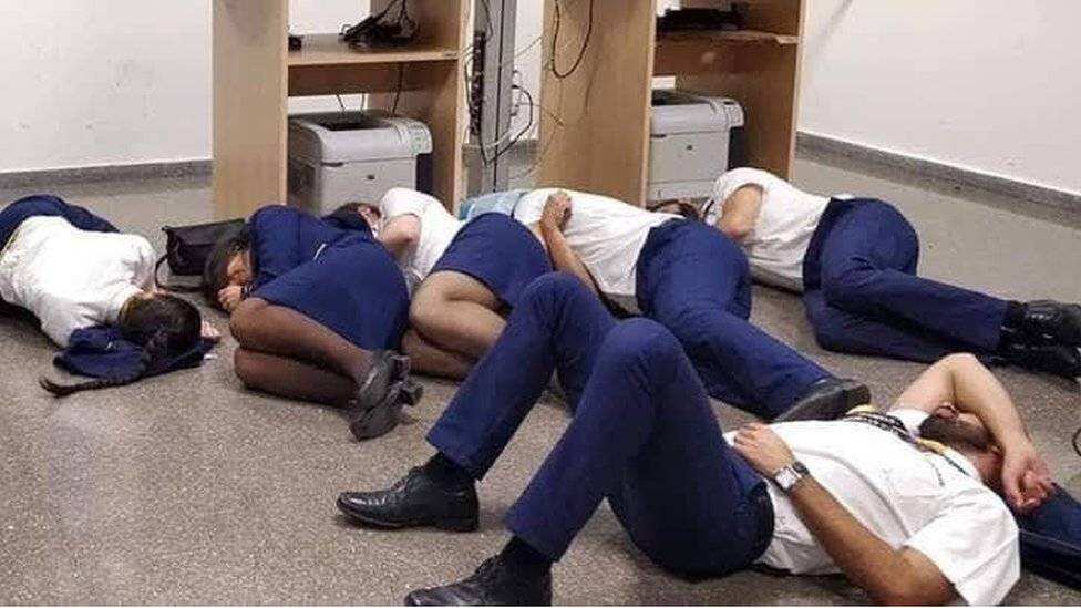 Según SNPVAC, muchos miembros de la tripulación fueron colocados en una sala entre las 1:30 y 6:00 "sin instalaciones mínimas de descanso", aunque el sindicato confirmó que el personal fue trasladado a una sala VIP a las 6:00.