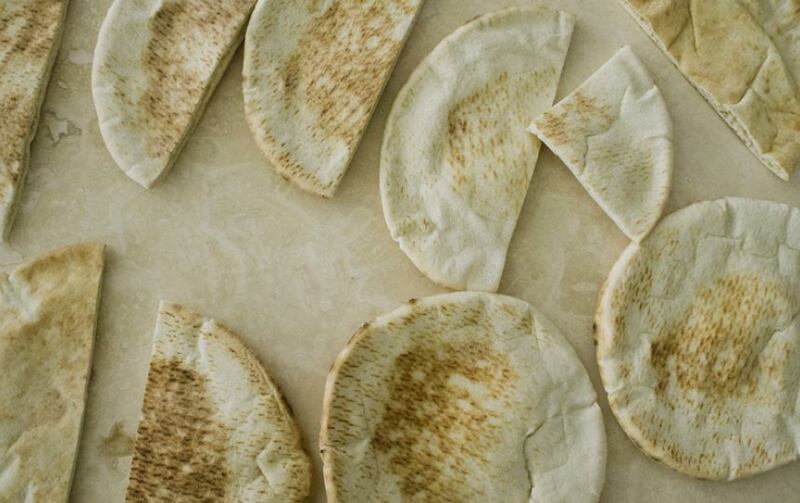 Corta cada pan pita por la mitad y ábrelo cuidadosamente para no romper los lados finitos y poder despegar el pan lo más profundo posible.