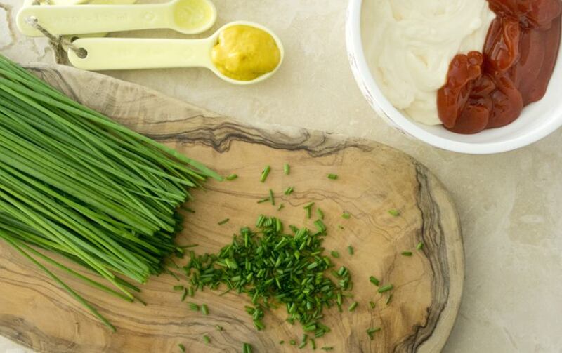 Salsa Mayo-Ketchup En un envase pequeño y profundo combina la mayonesa, el kétchup, la mostaza, la pizca sal y los cebollines hasta que la mezcla se vea homogénea. Cubre con un papel plástico de cocina y deja enfriar en la nevera mientras preparas los sandwiches.