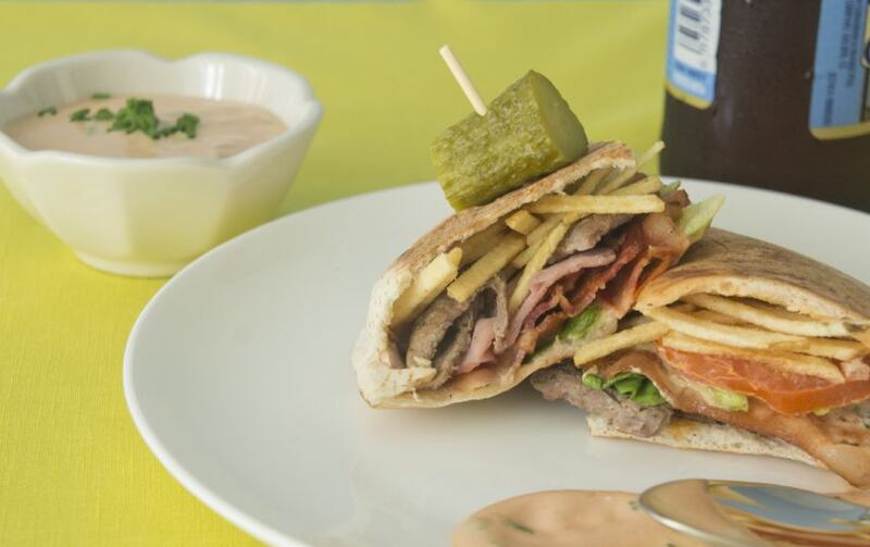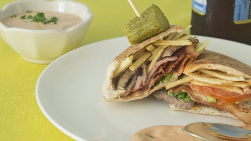Rellena cada mitad en este orden: de 3 a 4 pedazos de la carne, 1 ½ a dos lascas de jamón, de 2 a 3 mitades de la tocineta, 1 a 1 ½ CDA de la salsa mayo-ketchup, algunas hojas de lechuga, 2 rueditas de tomate y de 1 a 2 CDAS de las papitas. Coloca el sándwich en una plancha a temperatura media alta y, con su tapa o usando un picador de madera grueso, presiona un poco para tostar el pan pita, alrededor de 1 minuto, hasta que veas los bordecitos tostados y el pan se sienta crujiente. Si estás usando sartén abierto, con una espátula voltea el sándwich y repite el proceso. Retira del sartén. Puedes picar en mitades. Sirve inmediatamente.