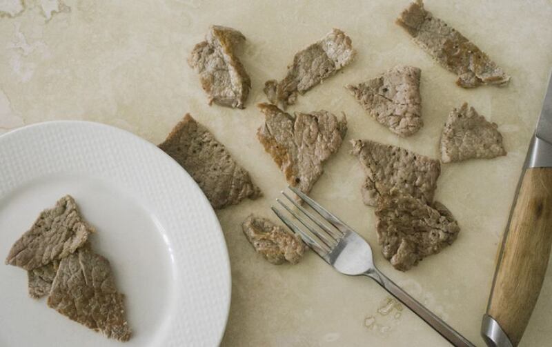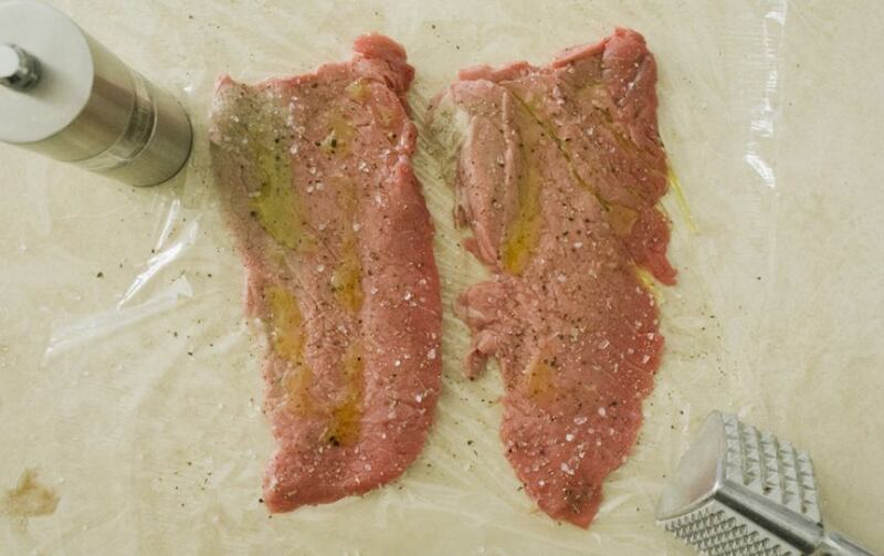 Si deseas puedes machacar la carne un poco cubriéndola con un papel plástico. Condiméntala con la sal restante, la pimienta y el aceite de oliva. En un sartén a temperatura media alta cocina ambos lados por 1 minuto o no más de 2, tipo vuelta y vuelta. Córtala en pedazos medianos.