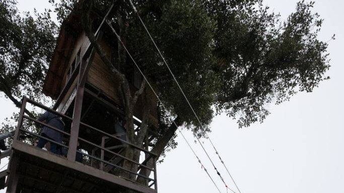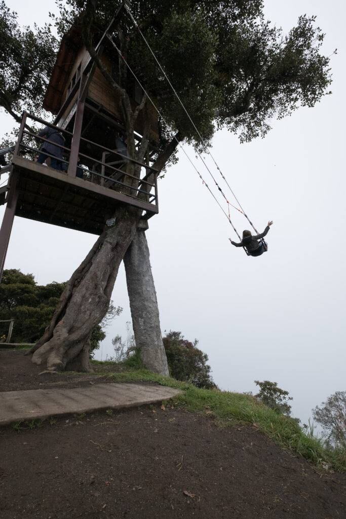 - La Casa del Árbol: También conocido como el columpio del fin del mundo, está también en Baños. Su razón de ser es monitoriar el volcán Tungurahua que queda justo al frente y el cual está activo desde el 1999. La Casa del Árbol poco a poco se convirtió en una parada obligada por tener un columpio que, como quien dice, uno se mece sobre un risco de más de 2,000 metros sobre el nivel del mar. Nosotros no pudimos apreciar la vista hacia el volcán porque el día estuvo lluvioso y con neblina. Pero nos mecimos y sentimos la adrenalina y la emoción de estar en el columpio del fin del mundo. Costo de entrada $2 por persona.