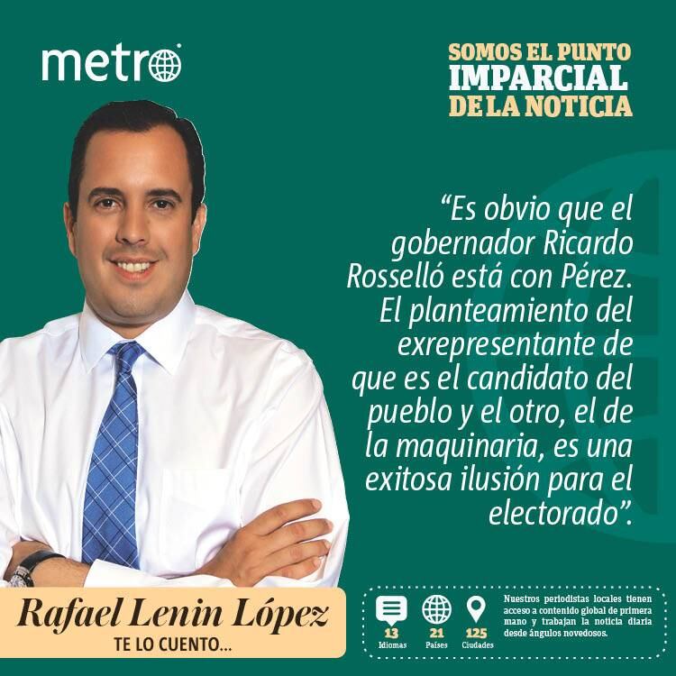 Es obvio que el gobernador Ricardo Rosselló está con Pérez. El planteamiento del exrepresentante de que es el candidato del pueblo y el otro, el de la maquinaria, es una exitosa ilusión para el electorado. De hecho, Pérez ha advertido que esta tarde, en su cierre de campaña, tendrá una visita importante y se rumora que es el propio gobernador.