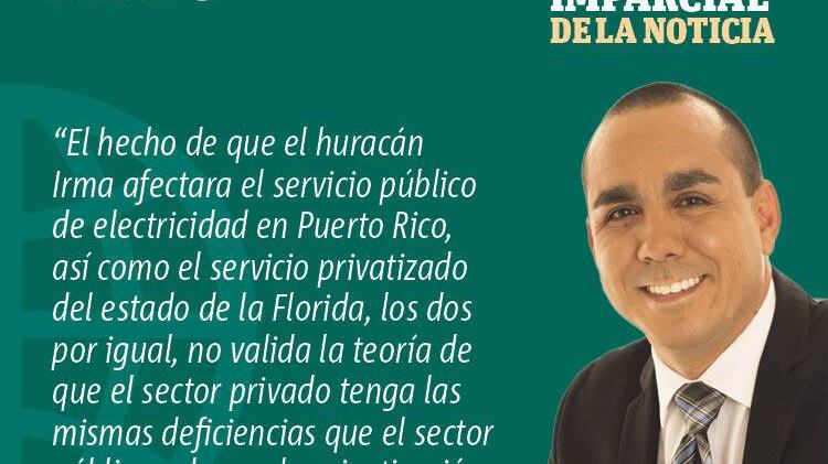 Dentro de todo el debate, renació el tema de la privatización, y creo que algunos análisis no son hechos con datos reales y pensados. Quizás sirvan para apoyar teorías en las que se creen, pero nuevamente, dichos análisis son hechos con información a medias. Me refiero al debate de si el sector privado tiene mayor eficiencia o no que el sector público. Yo sigo reafirmando que sí tiene mayor eficiencia. El hecho de que el huracán Irma afectara el servicio público de electricidad en Puerto Rico, así como el servicio privatizado del estado de la Florida, los dos por igual, no valida la teoría de que el sector privado tenga las mismas deficiencias que el sector público y de que la privatización no resuelva nada.