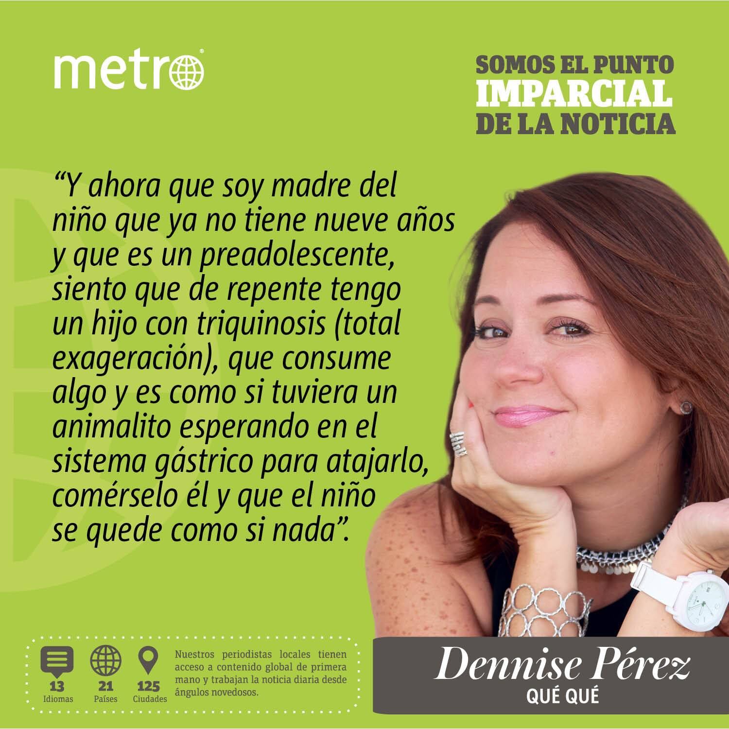 Y ahora que soy madre del niño que ya no tiene nueve años y que es un preadolescente, siento que de repente tengo un hijo con triquinosis (total exageración), que consume algo y es como si tuviera un animalito esperando en el sistema gástrico para atajarlo, comérselo él y que el niño se quede como si nada. Literalmente, de comer poco ha pasado a comer más que yo, y me atrevo a decir que casi más que su padre, porque al menos su padre conoce las consecuencias de comer mucho, pero, como mi hijo ni las conoce ni las ve en su cuerpo, no para. Ni pensar en el kid’s menu. Eso es un chiste para él y para sus tripas.