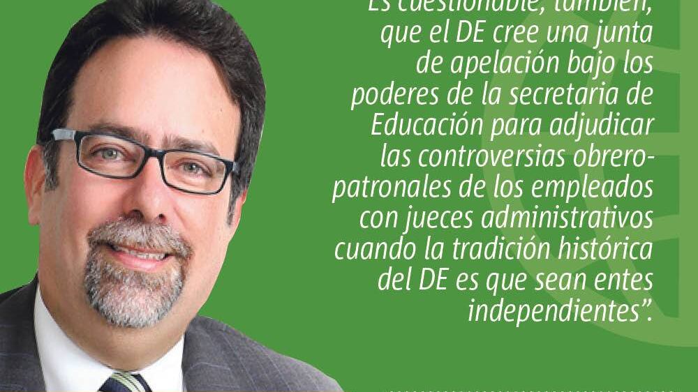 Es cuestionable, también, que el DE cree una junta de apelación bajo los poderes de la secretaria de Educación para adjudicar las controversias obrero-patronales de los empleados con jueces administrativos cuando la tradición histórica del DE es que sean entes independientes. Fue una ganancia de la Ley 45 los procesos de arbitraje con entes externos que no dependen del poder de designación de la secretaria de Educación.