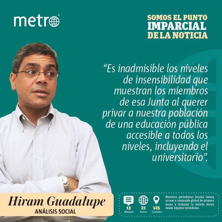 Es inadmisible los niveles de insensibilidad que muestran los miembros de esa Junta al querer privar a nuestra población de una educación pública accesible a todos los niveles, incluyendo el universitario; de pretender hundir en la extrema pobreza a nuestros jubilados con el recorte de sus pensiones; de cercenar las arcas públicas con reducciones al gasto social para disminuir los servicios básicos que recibe nuestra población, en particular los más desventajados y desamparados; y de procurar un ambiente de explotación al eliminar muchos de los derechos que protegen a nuestra clase trabajadora y facilita la reproducción de su fuerza laboral.