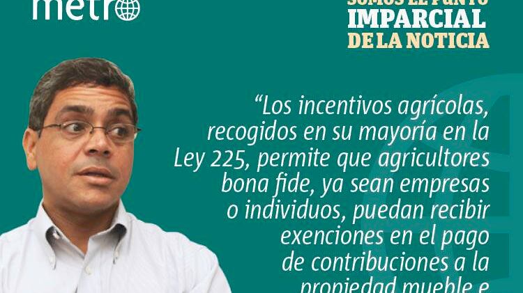 Los incentivos agrícolas, recogidos en su mayoría en la Ley 225, permite que agricultores bona fide, ya sean empresas o individuos, puedan recibir exenciones en el pago de contribuciones a la propiedad mueble e inmueble, patentes municipales, ingresos y arbitrios. La intención es proveer de un mecanismo fiscal que incentive la actividad agraria, al tiempo que propicia el surgimiento de nuevos empresarios agrícolas y el fortalecimiento de los existentes.
