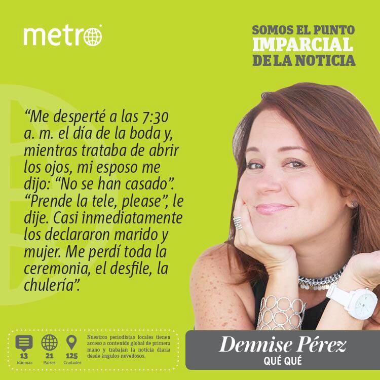 Me desperté a las 7:30 a. m. el día de la boda y, mientras trataba de abrir los ojos, mi esposo me dijo: “No se han casado”. “Prende la tele, please”, le dije. Casi inmediatamente los declararon marido y mujer. Me perdí toda la ceremonia, el desfile, la chulería.