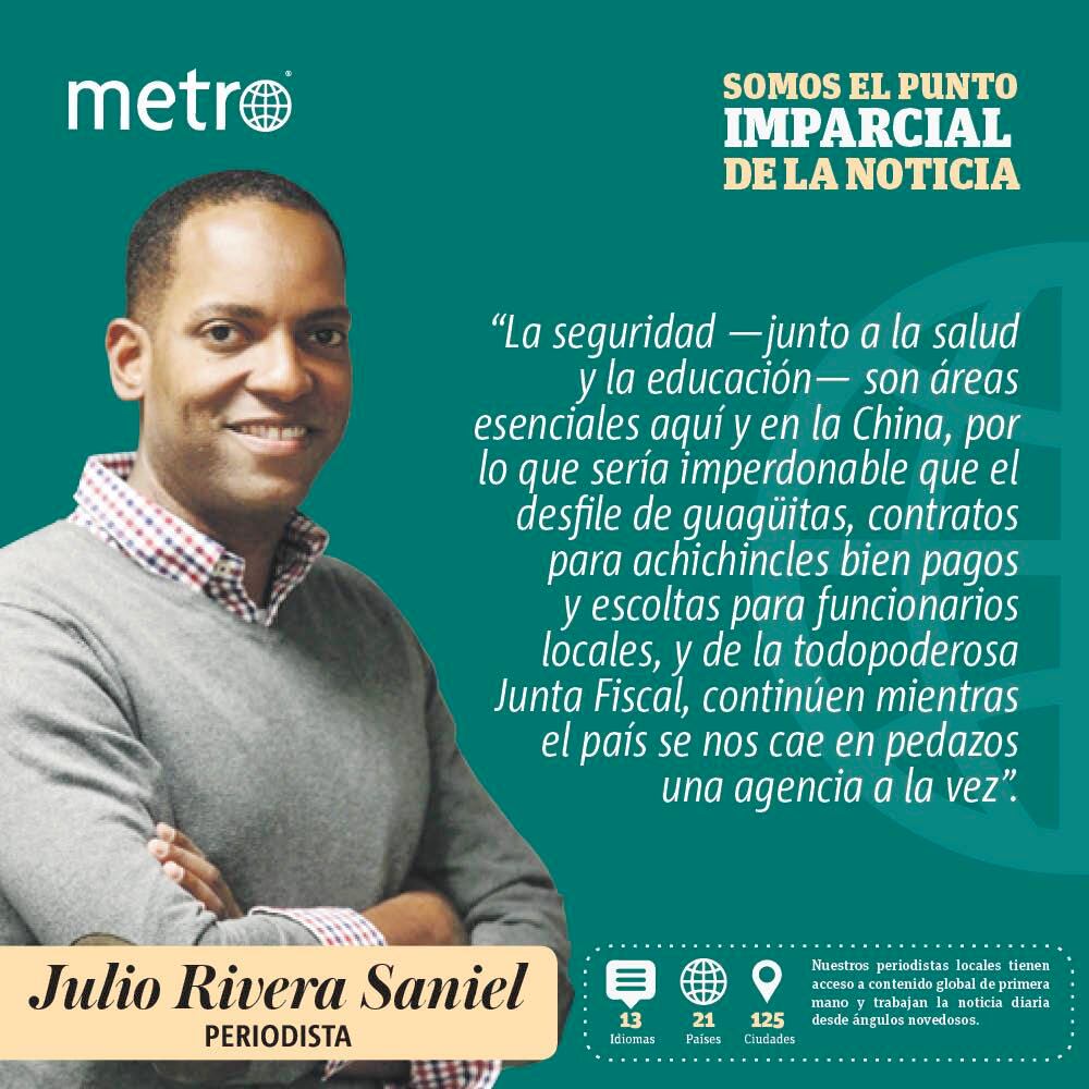 La seguridad — junto a la salud y la educación— son áreas esenciales aquí y en la China, por lo que sería imperdonable que el desfile de guagüitas, contratos para achichincles bien pagos y escoltas para funcionarios locales, y de la todopoderosa Junta Fiscal, continúen mientras el país se nos cae en pedazos una agencia a la vez. A buscar el dinero, señores, que con esto de una crisis ahora, y otra después, el horno no está para galletitas.