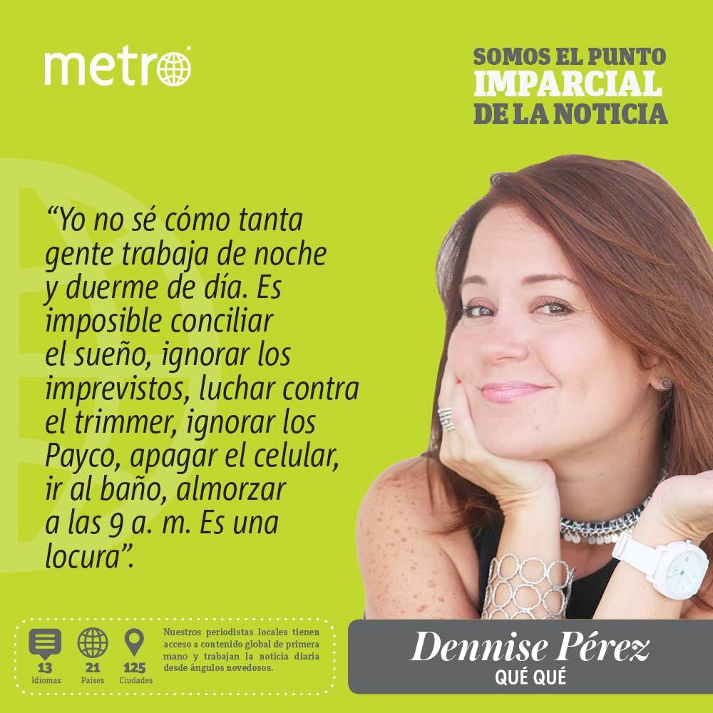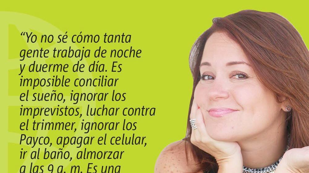 Yo no sé cómo tanta gente trabaja de noche y duerme de día. Es imposible conciliar el sueño, ignorar los imprevistos, luchar contra el trimmer, ignorar los Payco, apagar el celular, ir al baño, almorzar a las 9 a. m. Es una locura. Debe ser un acto contra la naturaleza. Si me ve bostezando, tenga piedad. Soy una especie de zombi, muy contenta con lo que hago, pero zombi. Y el malhumor, si tomo siesta, no se me quita ni con Snickers.