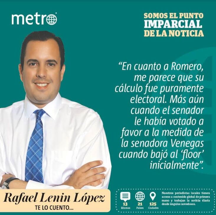 En cuanto a Romero, me parece que su cálculo fue puramente electoral. Más aún cuando el senador le había votado a favor a la medida de la senadora Venegas cuando bajó al floor inicialmente. Ahora Romero, estando en el spot sobre este tema, ha tenido que decidir de qué lado del electorado se ubica de cara a una candidatura por la alcaldía de San Juan.