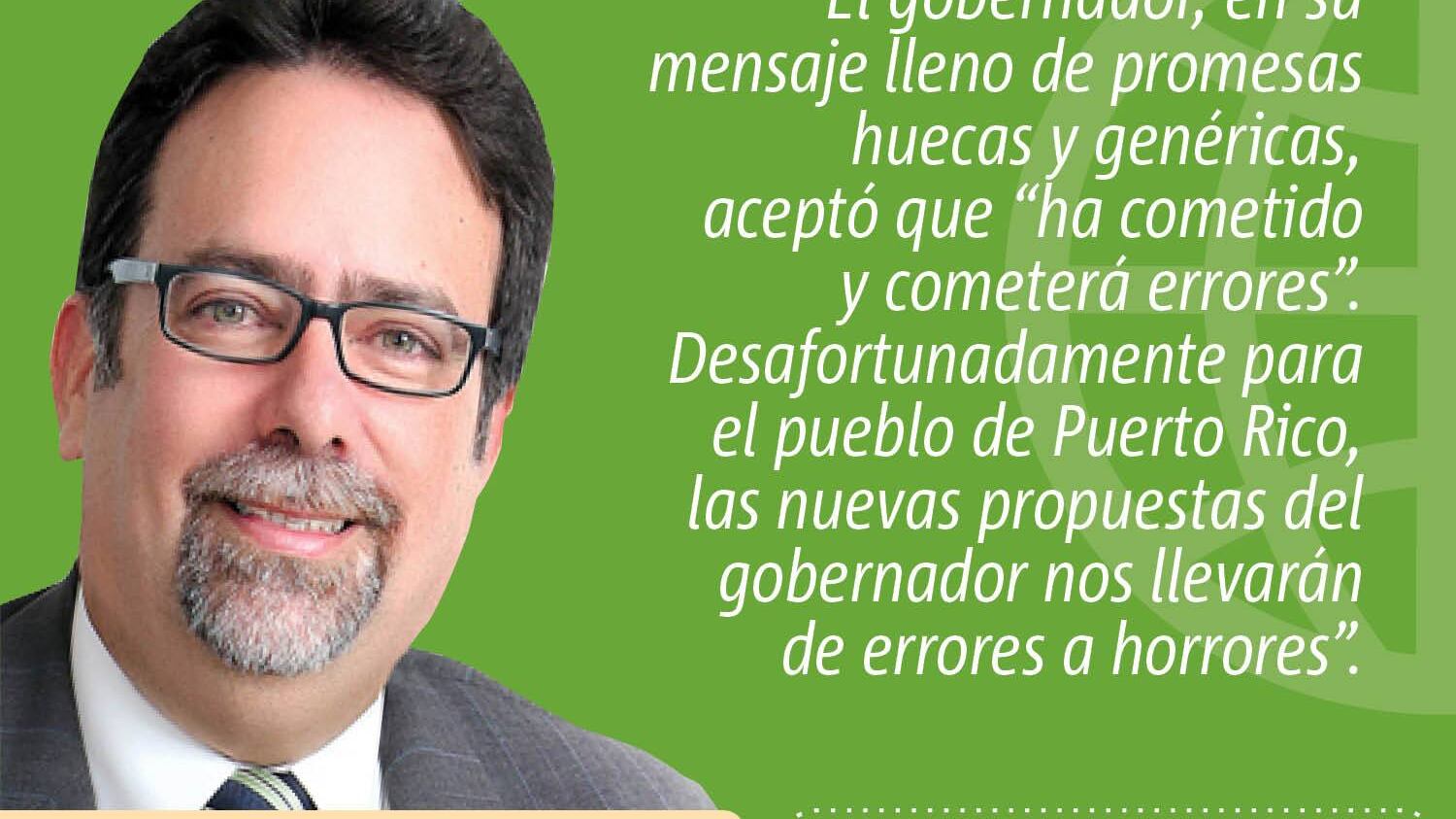 El gobernador, en su mensaje lleno de promesas huecas y genéricas, aceptó que “ha cometido y cometerá errores”. Desafortunadamente para el pueblo de Puerto Rico, las nuevas propuestas del gobernador nos llevarán de errores a horrores.