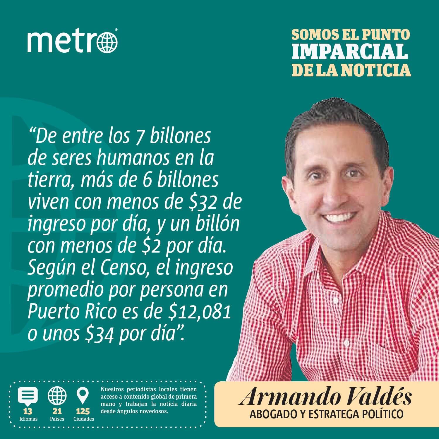 Que no todo es como se pinta en los medios de comunicación. Hay muchos que se regodean en proyectar únicamente lo negativo y celebran cuando aparecemos en las últimas posiciones en diversos índices de desarrollo. En realidad, conforme a dos de los mejores indicadores de progreso, los puertorriqueños estamos entre el billón de personas más agraciadas del mundo. De entre los 7 billones de seres humanos en la tierra, más de 6 billones viven con menos de $32 de ingreso por día, y un billón con menos de $2 por día. Según el Censo, el ingreso promedio por persona en Puerto Rico es de $12,081 o unos $34 por día. En cuanto a expectativa de vida, los puertorriqueños en promedio llegamos hasta los 79.79 años, según el Banco Mundial, mientras que los estadounidenses llegan solo hasta los 78.69.