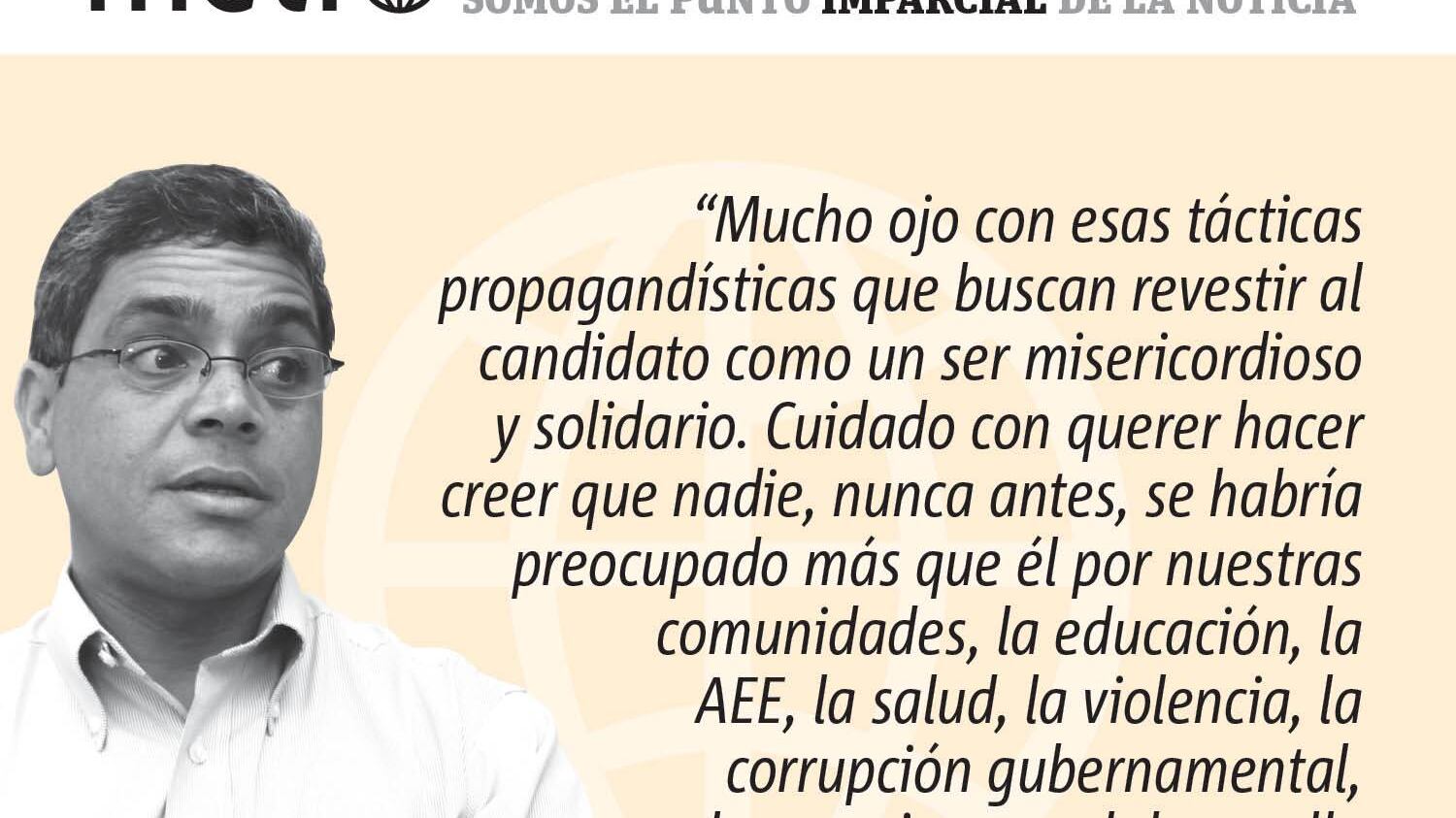 Quienes ordenan los hilos de la campaña de Pierluisi deben tener más cautela en cómo trazan la representación pública del político. Mucho ojo con esas tácticas propagandísticas que buscan revestir al candidato como un ser misericordioso y solidario. Cuidado con querer hacer creer que nadie, nunca antes, se habría preocupado más que él por nuestras comunidades, la educación, la AEE, la salud, la violencia, la corrupción gubernamental, las pensiones y el desarrollo económico.