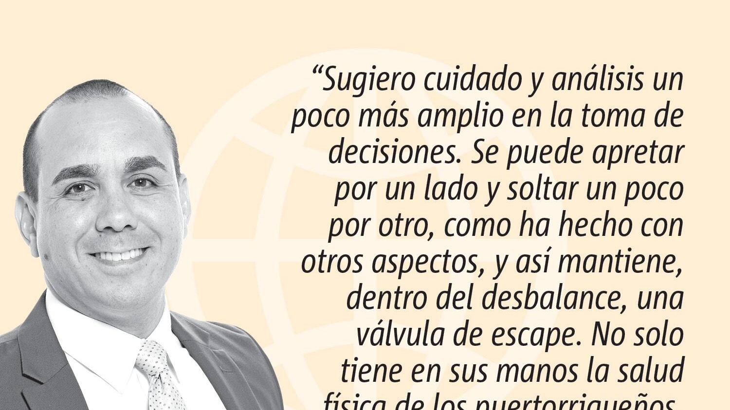 Sugiero cuidado y análisis un poco más amplio en la toma de decisiones. Se puede apretar por un lado y soltar un poco por otro, como ha hecho con otros aspectos, y así mantiene, dentro del desbalance, una válvula de escape. No solo tiene en sus manos la salud física de los puertorriqueños, también tiene la mental. La ciudadanía está cooperando, pero no debe llevarlos al punto de asfixie porque pasa lo que pasó en los pasados días, y por más que entiendan los riesgos de salir, pueden entender también que no les quedará de otra y se tirarán a la calle. Ya lo hicieron esta semana.