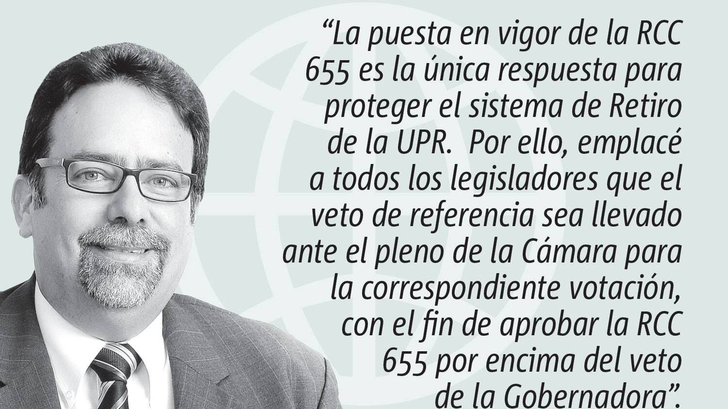 La puesta en vigor de la RCC 655 es la única respuesta para proteger el sistema de Retiro de la UPR. Por ello, emplacé a todos los legisladores que el veto de referencia sea llevado ante el pleno de la Cámara para la correspondiente votación, con el fin de aprobar la RCC 655 por encima del veto de la Gobernadora.