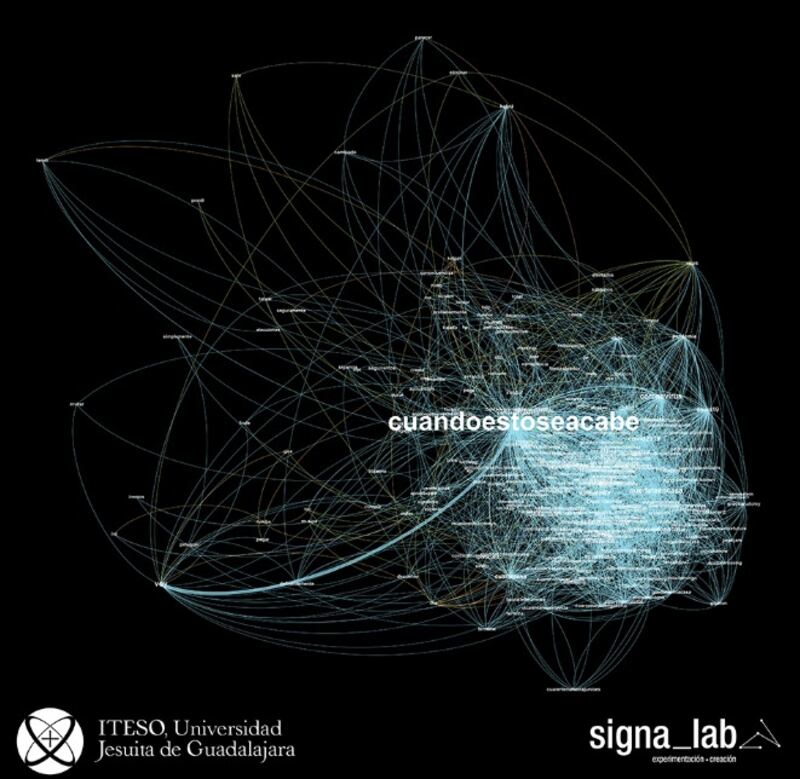 Red de relaciones entre pares de palabras (bigrama) dado el cuerpo de texto descargado de 14,166 tweets que mencionaron el hashtag #CuandoEstoSeAcabe del 21 al 28 de marzo de 2020. En esta galería de imágenes se despliegan una versión que agrupa a los nodos esenciales para la esctructura de la red y distintas zonas específicas de la misma, filtradas a partir de comunidades selectas y vecinos inmediatos (ego network) de palabras clave. Esta red permite identificar relaciones semánticas en mensajes que se compartieron alrededor de dicho hashtag, que se calculan a partir del orden y frecuencia en que fueron combinadas sus palabras dentro de de cada tweet.