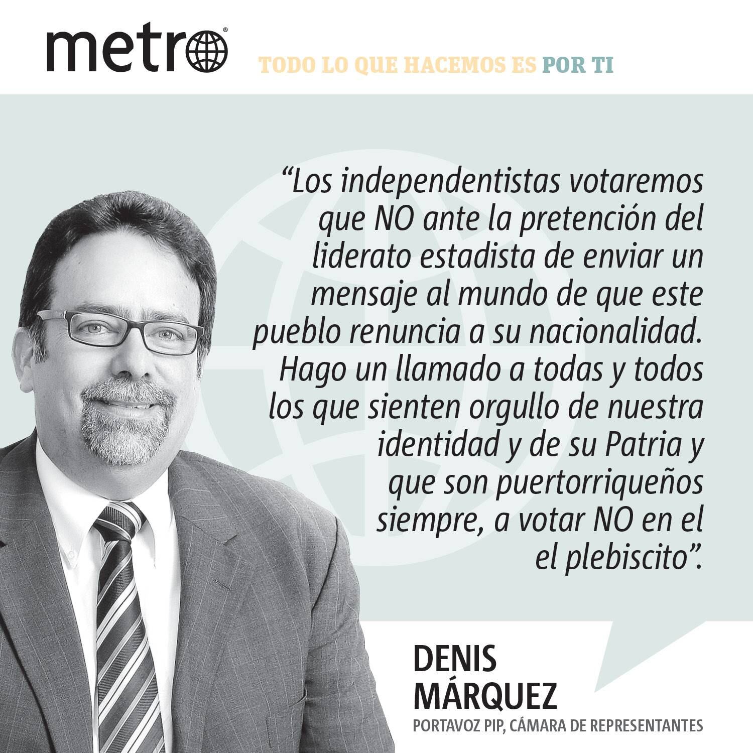 No obstante, habiendo tomado dicha determinación legislativa, nuestra posición política es la de votar y hacer campaña por el NO para enviar un mensaje claro y contundente al mundo entero de que los puertorriqueñas jamás renunciaremos a nuestra puertorriqueñidad, nuestra cultura e idioma. Que somos un país caribeño, latinoamericano y que nuestra mayor aspiración es la de mandarnos a nosotros mismos como el resto de las naciones del mundo.