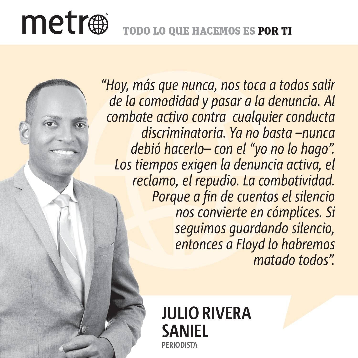 Yo tuve la suerte de tener las armas para enfrentar a un mundo que –como norma- piensa que lo que soy no es suficiente o una excepción. Para ahogar las voces que en el camino intentan hacerte dudar y limitar tus posibilidades. Nunca las escuché. Pero esas voces a veces son ensordecedoras. Y aunque soy yo y solo yo quien controla como me veo a mí mismo, está claro que allá afuera hay un mundo que insiste en querer verme a mí y a quienes lucen como yo como inferiores. Tanto como para creerse con el derecho de detener a un hombre, clavarle una rodilla en el cuello y dejarlo ahogarse escudado en un gran “porque sí”. Controlo como me veo a mi mismo pero ello no me garantiza inmunidad ante agresiones como esa que acabó con George y con decenas como como él y como yo, antes. En tiempo reciente, Esas voces se han visto envalentonadas por un discurso árido, nocivo y poco inteligente que llega desde las altas esferas del poder en Estados Unidos y el mundo. Por eso hoy, más que nunca, nos toca a todos salir de la comodidad y pasar a la denuncia. Al combate activo contra cualquier conducta discriminatoria. Ya no basta –nunca debió hacerlo- con el “yo no lo hago”. Los tiempos exigen la denuncia activa, el reclamo, el repudio. La combatividad. Porque a fin de cuentas el silencio nos convierte en cómplices. Si seguimos guardando silencio, entonces a Floyd lo habremos matado todos.