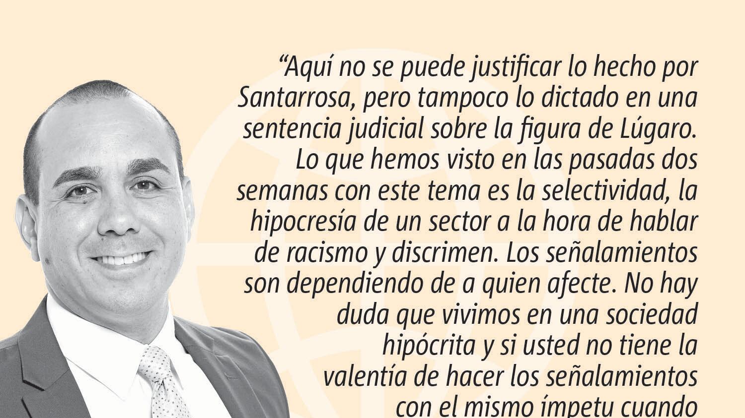 Aquí no se puede justificar lo hecho por Santarrosa, pero tampoco lo dictado en una sentencia judicial sobre la figura de Lúgaro. Lo que hemos visto en las pasadas dos semanas con este tema es la selectividad, la hipocresía de un sector a la hora de hablar de racismo y discrimen. Los señalamientos son dependiendo de a quien afecte. No hay duda que vivimos en una sociedad hipócrita y si usted no tiene la valentía de hacer los señalamientos con el mismo ímpetu cuando se trata de alguien con quien simpatiza, usted es otro hipócrita.