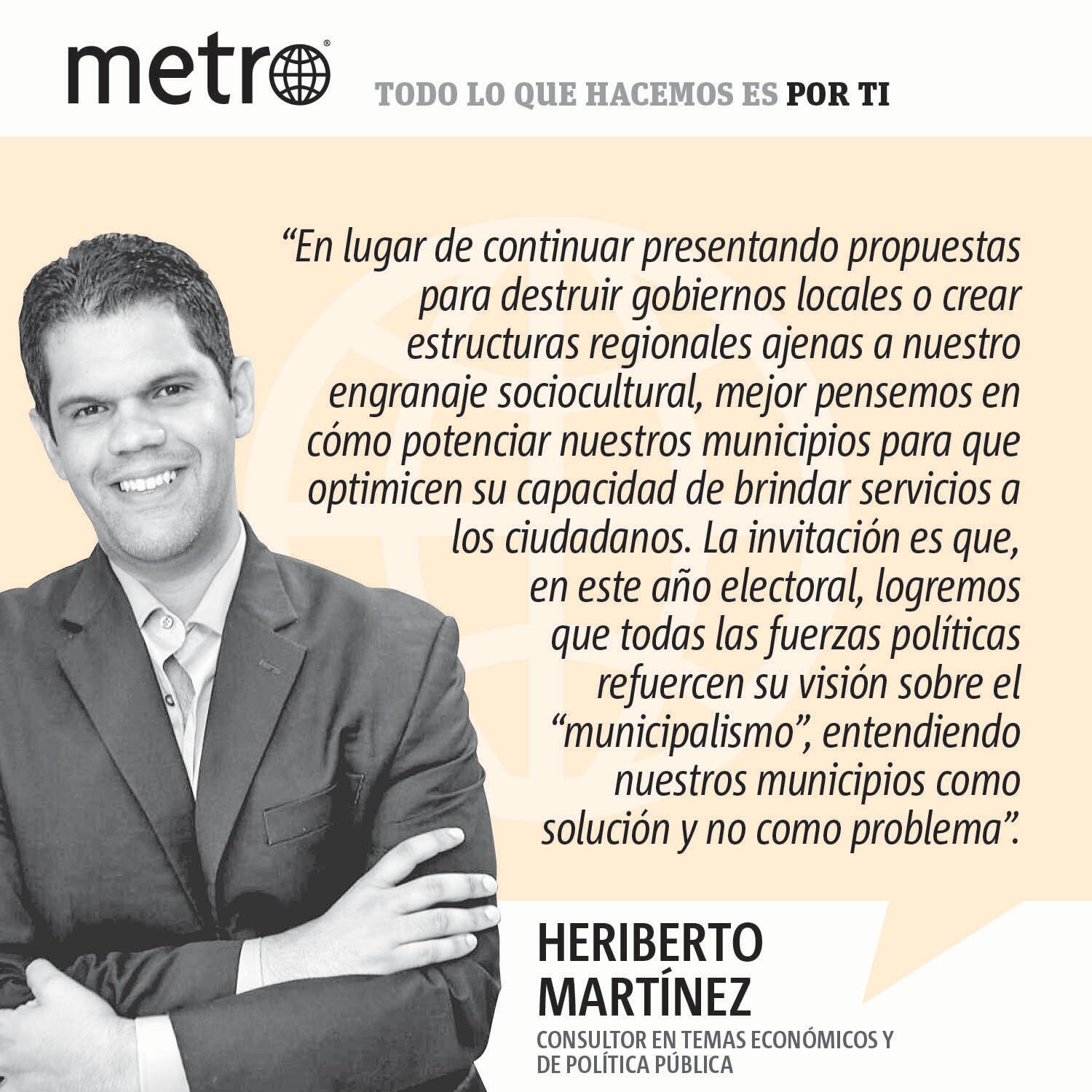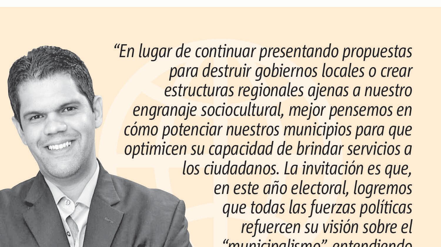 En los municipios queda mucho por trabajar y evolucionar. Hay que trabajar en temas como “gobernanza democrática”, red de economía local, y planificación urbana; pero para eso hay que insistir en que los municipios son instituciones de avanzada que representan parte esencial de las instituciones que ofrecen soluciones locales para retos globales. Dentro del marco “municipalista” es que tenemos que pensar en cómo se va a articular la política pública para esta próxima década. En lugar de continuar presentando propuestas para destruir gobiernos locales o crear estructuras regionales ajenas a nuestro engranaje sociocultural, mejor pensemos en cómo potenciar nuestros municipios para que optimicen su capacidad de brindar servicios a los ciudadanos. La invitación es que, en este año electoral, logremos que todas las fuerzas políticas refuercen su visión sobre el “municipalismo”, entendiendo nuestros municipios como solución y no como problema.