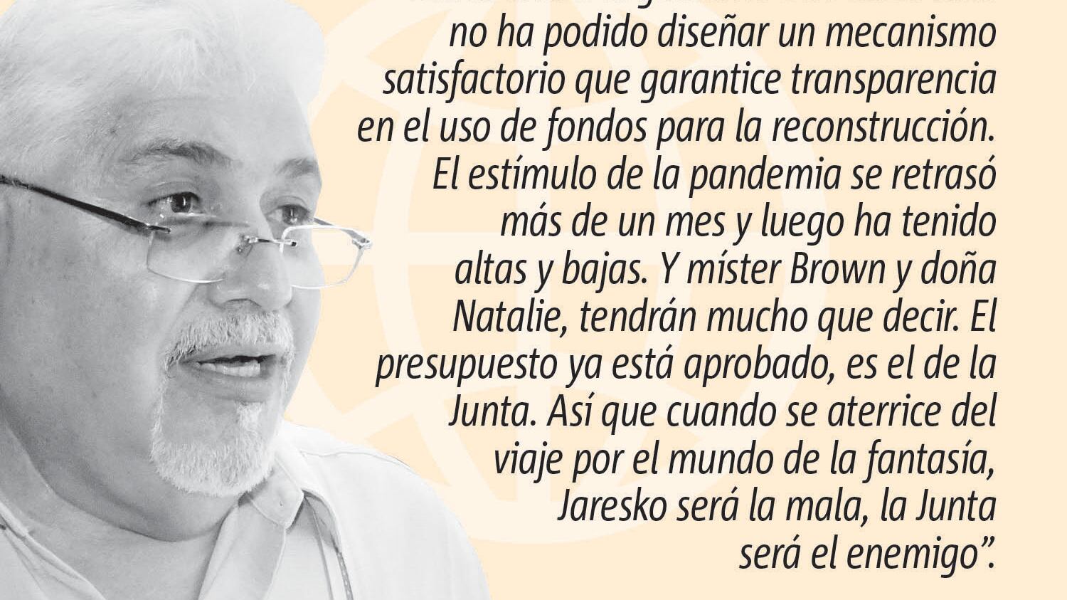 Pero como dice el americano, “not so fast”, o como decimos los puertorriqueños, “cógelo suave”. Hasta ahora el gobierno de Puerto Rico no ha podido diseñar un mecanismo satisfactorio que garantice transparencia en el uso de fondos para la reconstrucción. El estímulo de la pandemia se retrasó más de un mes y luego ha tenido altas y bajas. Y míster Brown y doña Natalie, tendrán mucho que decir. El presupuesto ya está aprobado, es el de la Junta. Así que cuando se aterrice del viaje por el mundo de la fantasía, Jaresko será la mala, la Junta será el enemigo.