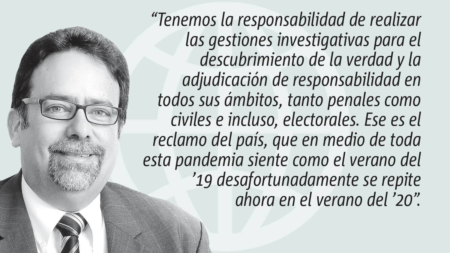 Hay que continuar indagando e iniciar investigaciones sobre los escándalos más recientes, la dejadez, la impunidad y el mirar para el otro lado no pueden continuar. Tenemos la responsabilidad de realizar las gestiones investigativas para el descubrimiento de la verdad y la adjudicación de responsabilidad en todos sus ámbitos, tanto penales como civiles e incluso, electorales. Ese es el reclamo del país, que en medio de toda esta pandemia siente como el verano del ’19 desafortunadamente se repite ahora en el verano del ’20.