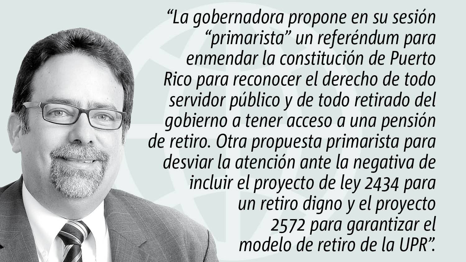 La gobernadora propone en su sesión “primarista” un referéndum para enmendar la constitución de Puerto Rico para reconocer el derecho de todo servidor público y de todo retirado del gobierno a tener acceso a una pensión de retiro. Otra propuesta primarista para desviar la atención ante la negativa de incluir el proyecto de ley 2434 para un retiro digno y el proyecto 2572 para garantizar el modelo de retiro de la UPR. Siempre hemos apoyado y defendido al trabajador público y sus sistemas de retiro, destruidos y quebrados por los gobiernos PNPPD.