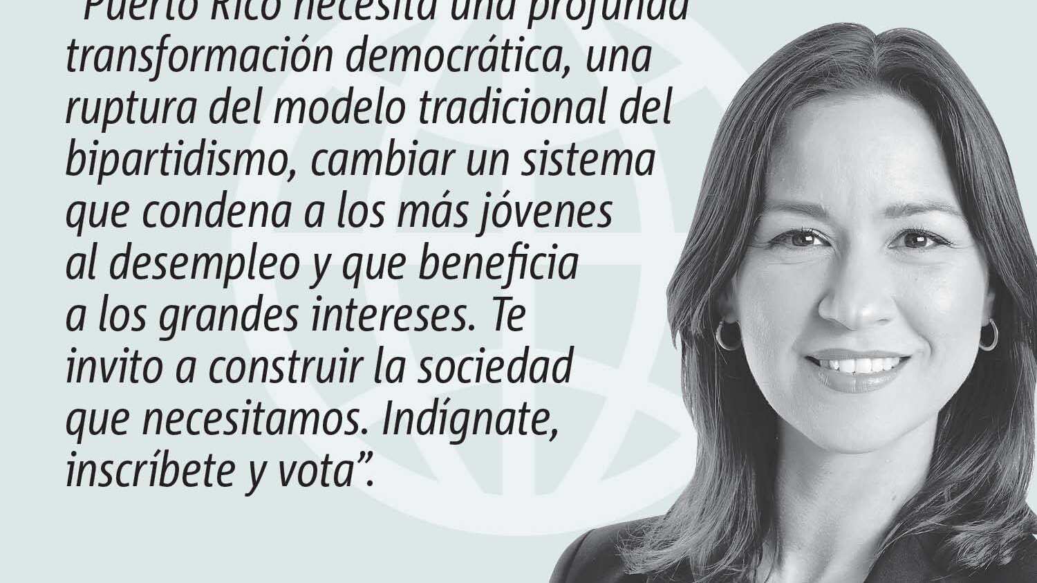 Puerto Rico necesita una profunda transformación democrática, una ruptura del modelo tradicional del bipartidismo, cambiar un sistema que condena a los más jóvenes al desempleo y que beneficia a los grandes intereses. Te invito a construir la sociedad que necesitamos. Indígnate, inscríbete y vota.