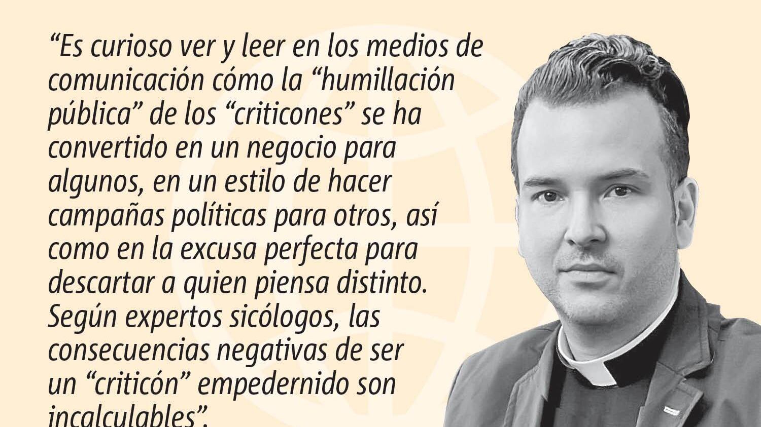 Es curioso ver y leer en los medios de comunicación cómo la “humillación pública” de los “criticones” se ha convertido en un negocio para algunos, en un estilo de hacer campañas políticas para otros, así como en la excusa perfecta para descartar a quien piensa distinto. Según expertos sicólogos, las consecuencias negativas de ser un “criticón” empedernido son incalculables. La dimensión religiosa, presente en cada ser humano, nos propone cualidades para sanear esta deficiencia de la personalidad. Mahatma Gandhi decía: “no hay bienestar sin trabajo, goce sin responsabilidad, religión sin sacrificio, educación sin carácter, política sin principios, ni ciencia sin humanidad”. Quien siga estas recomendaciones dejará de ser un “criticón” y se convertirá en un agente que, sin descartar a nadie, promueva cambios radicales desde la paz y la serenidad que supone la crítica constructiva.