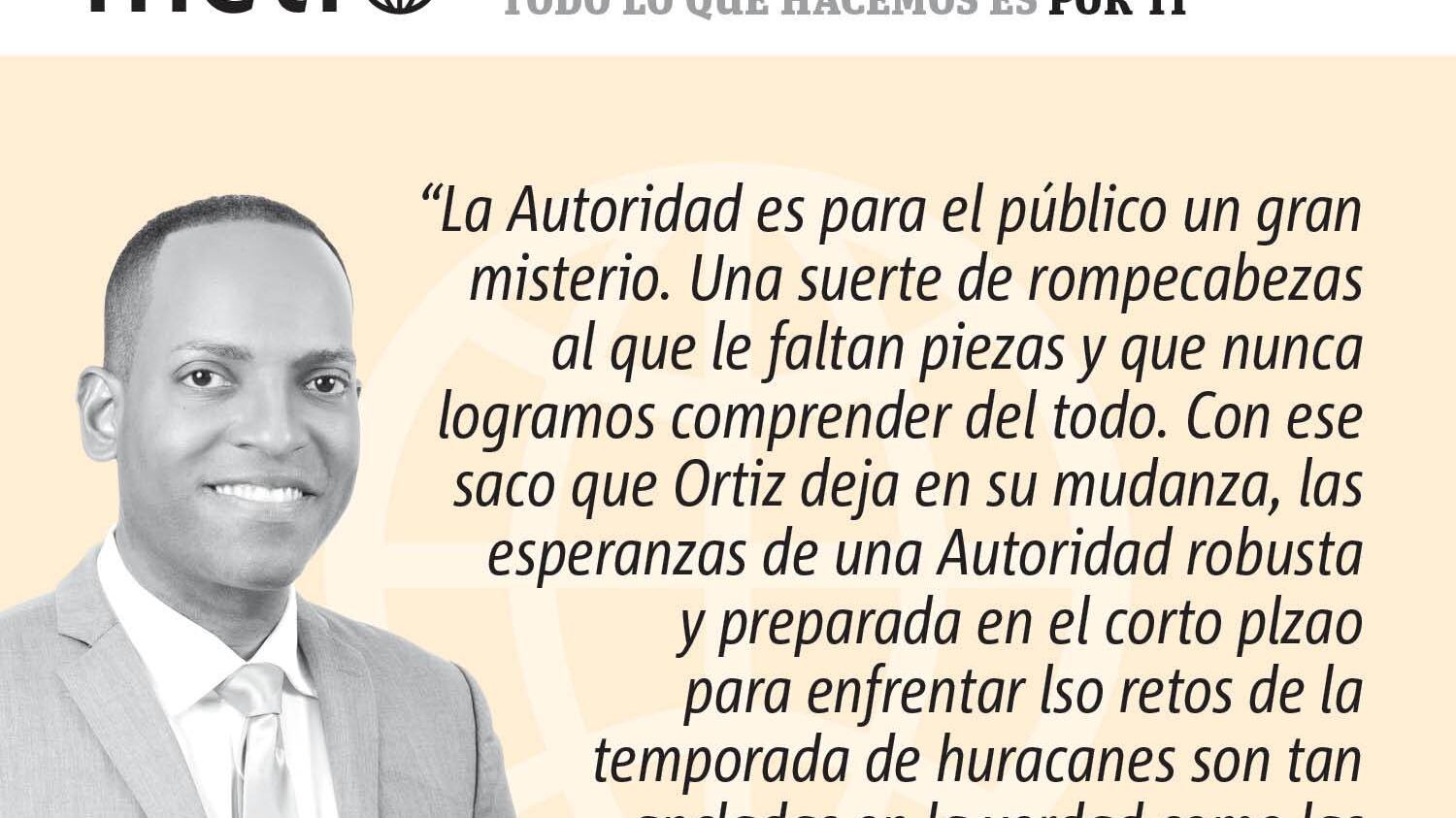 José Ortíz se marcha pero al irse no se resuelve el hecho de que nuestro sistema eléctrico no tiene ” redundancia”. Por ello, si un tramo de la red sale de servicio no existe un “plan b” para garantizar la continuidad de la energía a los abonados. José Ortíz se fue pero deja una autoridad que sigue dependiendo de los combustibles fósiles y que no ha sido capaz de impulsar mejores en la dirección de integrar fuentes alternas de energía. José Ortíz se marcha pero la AEE sigue insolvente y en medio de litigios con sus acreedores. Se va, pero la luz no baja, no bajará , lo que es peor, es que es posible que la tarifa que usted paga aumente. José Ortiz deja la silla luego de una incumbencia caracterizada por la falta de acceso a la Prensa y, con ello, al país. Un enquistamiento que redundó en la escasez de rendimiento de cuentas. LA Junta de Gobierno que permanece nunca exigió -que se sepa- predicar la transparencia con los hechos. En consecuencia, la Autoridad es para el público un gran misterio. Una suerte de rompecabezas al que le faltan piezas y que nunca logramos comprender del todo. Con ese saco que Ortiz deja en su mudanza, las esperanzas de una Autoridad robusta y preparada en el corto plzao para enfrentar lso retos de la temporada de huracanes son tan ancladas en la verdad como las teorías caducas del terrorismo que nos deja a oscuras.