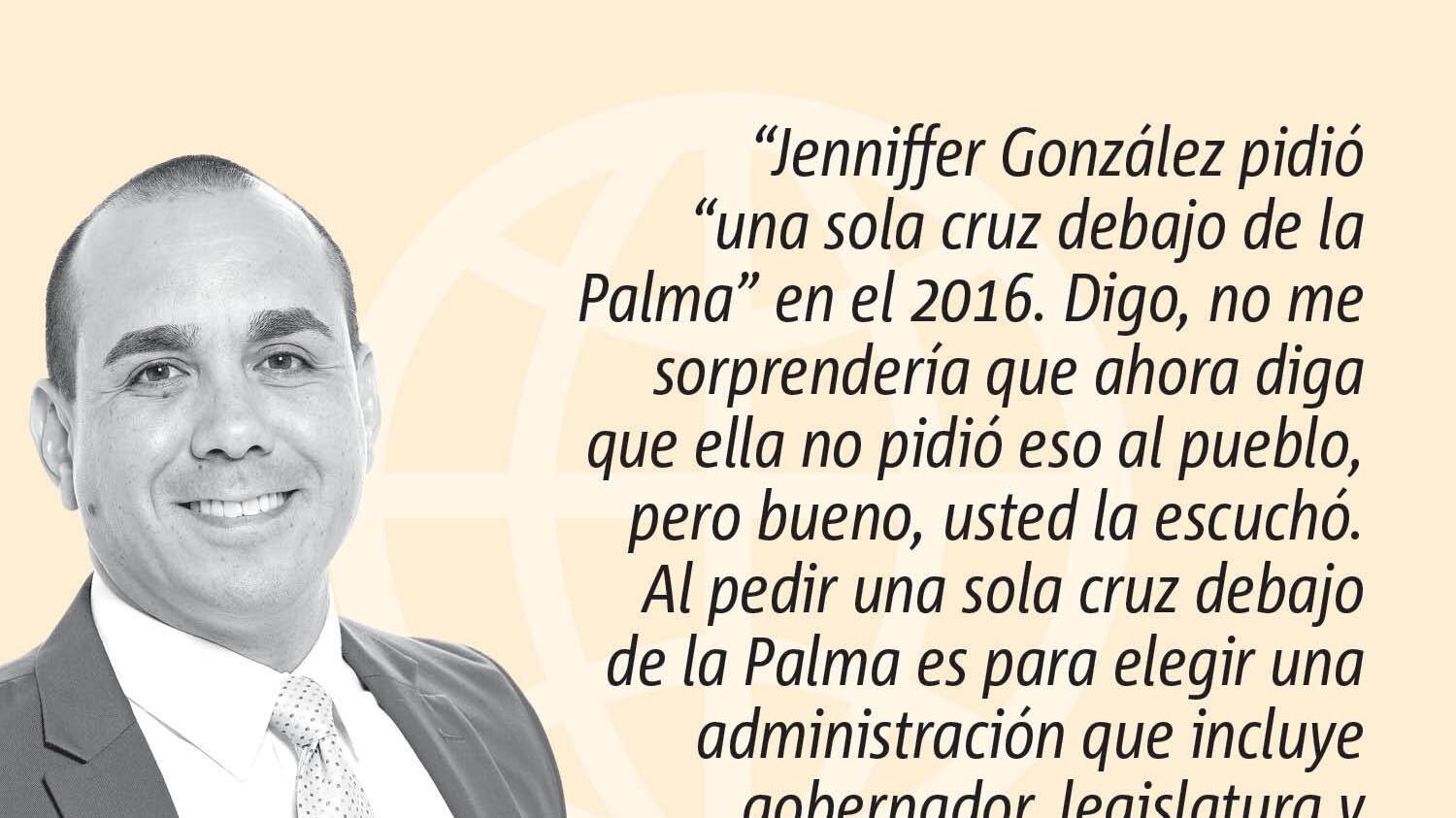 Jenniffer González pidió “una sola cruz debajo de la palma” en el 2016. Digo, no me sorprendería que ahora diga que ella no pidió eso al pueblo, pero bueno, usted la escuchó. Al pedir una sola cruz debajo de la palma es para elegir una administración que incluye gobernador, legislatura y comisionado residente. Piden la sola cruz debajo de la Palma argumentando que son el mejor equipo.