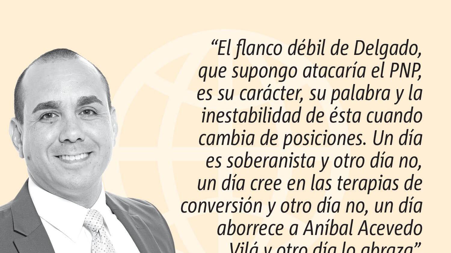 El flanco débil de Delgado, que supongo atacaría el PNP, es su carácter, su palabra y la inestabilidad de ésta cuando cambia de posiciones. Un día es soberanista y otro día no, un día cree en las terapias de conversión y otro día no, un día aborrece a Aníbal Acevedo Vilá y otro día lo abraza.