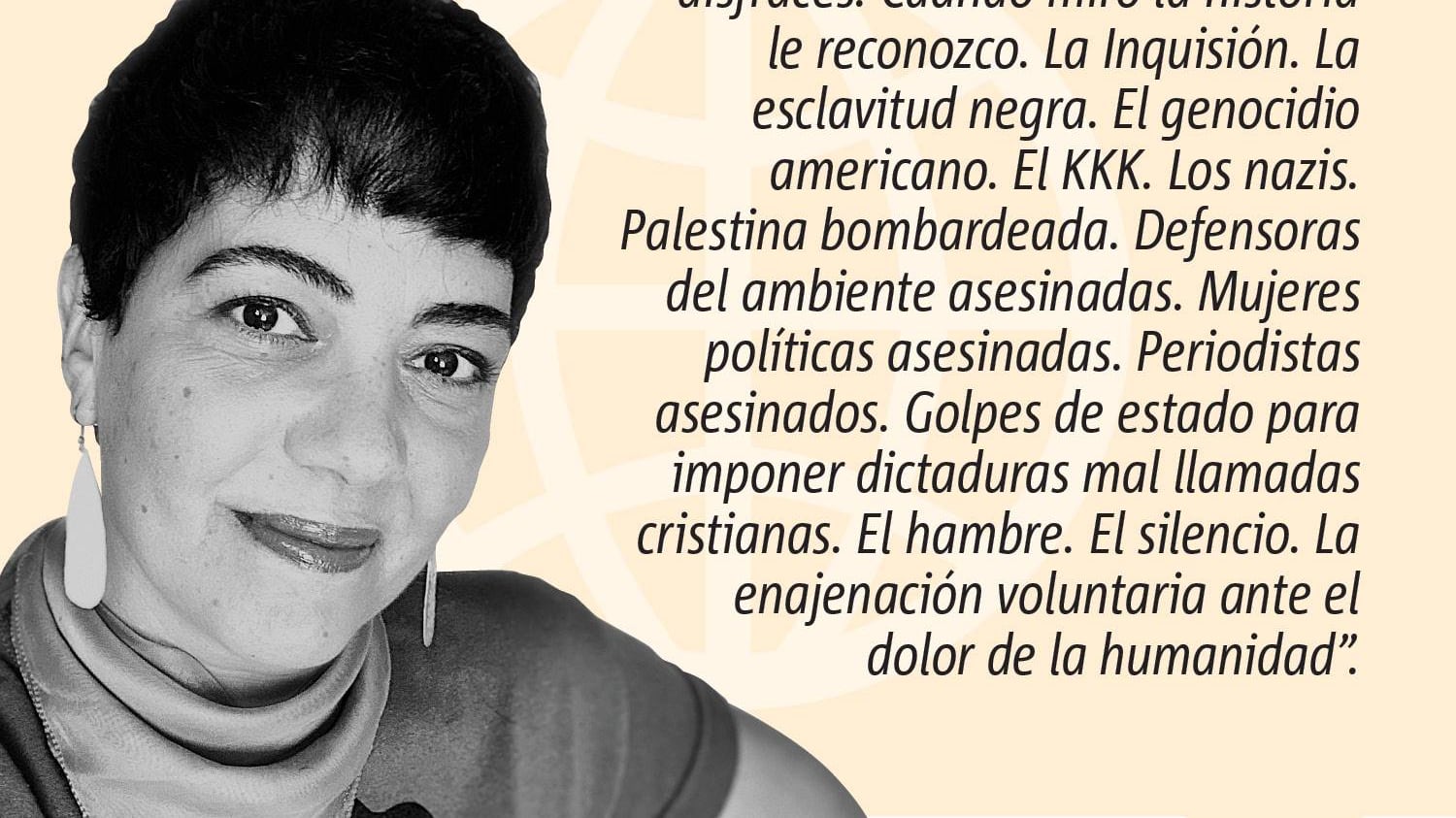 El odio tiene muchos nombres y muchos disfraces. Cuando miro la historia le reconozco. La Inquisión. La esclavitud negra. El genocidio americano. El KKK. Los nazis. Palestina bombardeada. Defensoras del ambiente asesinadas. Mujeres políticas asesinadas. Periodistas asesinados. Golpes de estado para imponer dictaduras mal llamadas cristianas. El hambre. El silencio. La enajenación voluntaria ante el dolor de la humanidad.