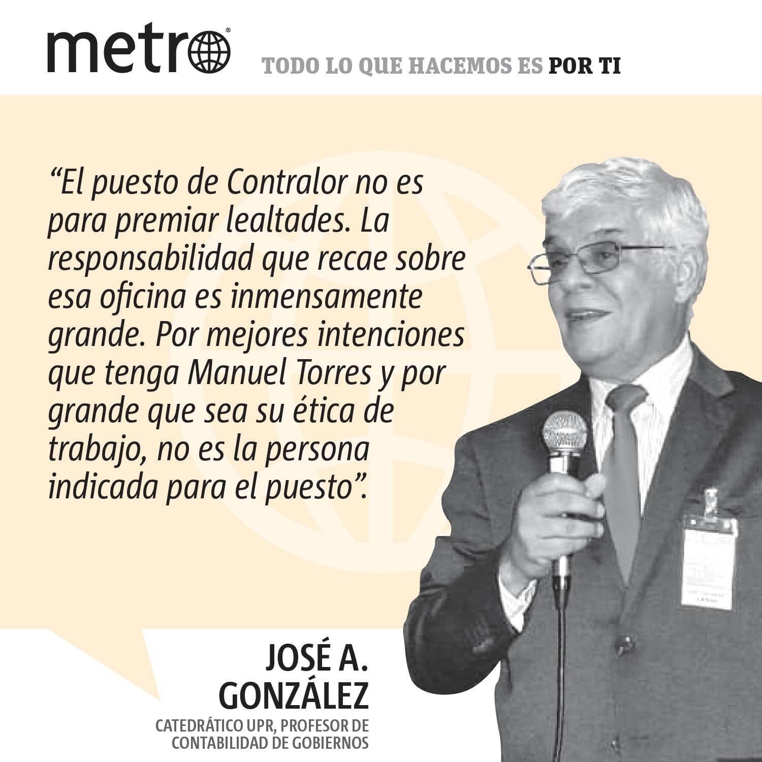 El presidente del Senado está impulsando al actual secretario de dicho cuerpo, Manuel Torres, para que la gobernadora lo nombre contralor. Conozco a Manuel Torres. Fue mi alumno cuando hizo su maestría en la Escuela de Administración Pública de la UPR. Le tengo mucho aprecio. Es un buen ser humano y un trabajador dedicado. Pero ni su experiencia como secretario del Senado ni su experiencia como Contralor Electoral le cualifican para ser Contralor de Puerto Rico.