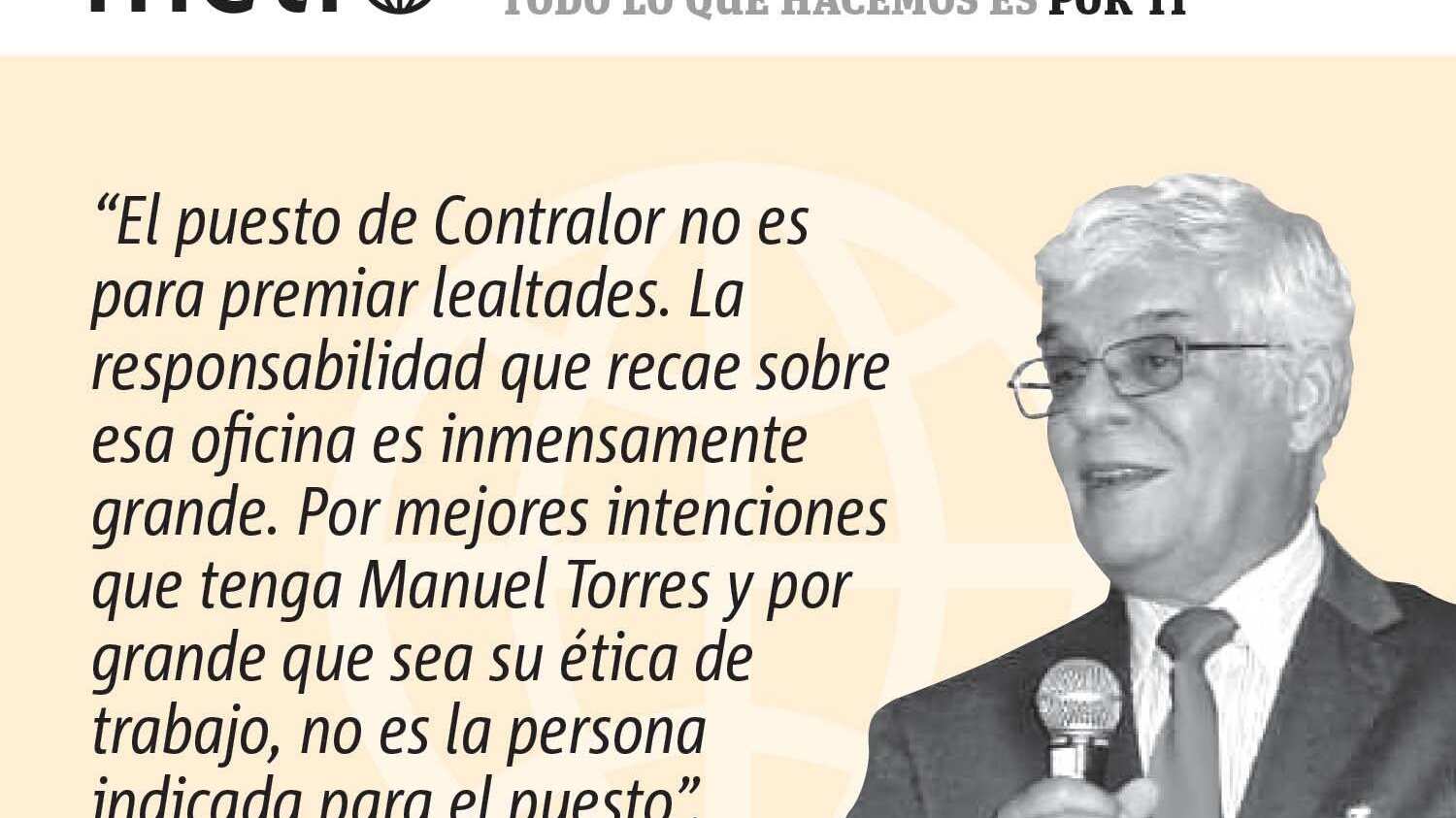 El puesto de Contralor no es para premiar lealtades. La responsabilidad que recae sobre esa oficina es inmensamente grande. Por mejores intenciones que tenga Manuel Torres y por grande que sea su ética de trabajo, no es la persona indicada para el puesto. Insisto que la persona que ocupe ese puesto debe ser un(a) CPA con amplia y relevante experiencia. Estoy seguro que hay muchos otros puestos que Manuel Torres puede ocupar y servir admirablemente.