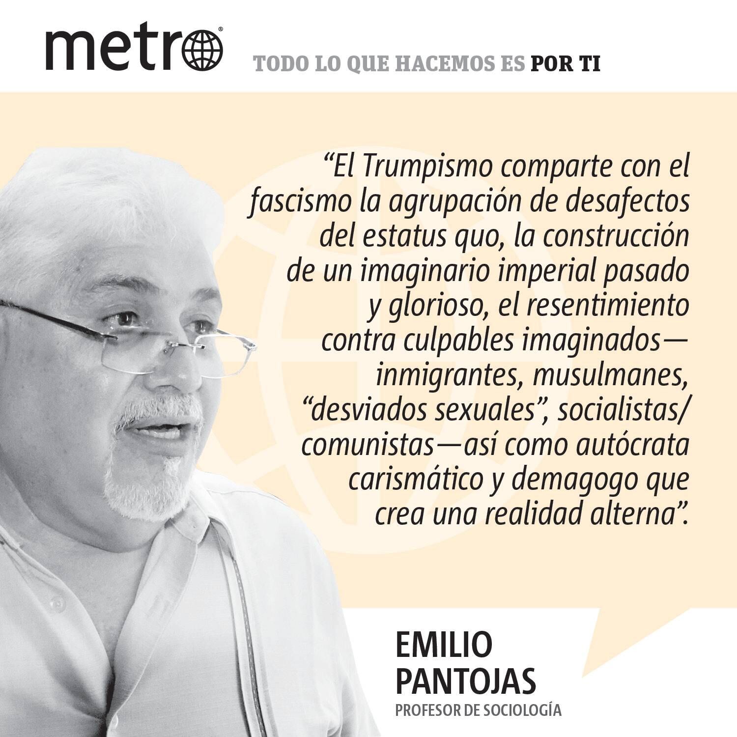 El Trumpismo comparte con el fascismo la agrupación de desafectos del estatus quo, la construcción de un imaginario imperial pasado y glorioso, el resentimiento contra culpables imaginados—inmigrantes, musulmanes, “desviados sexuales”, socialistas/comunistas—así como un autócrata carismático y demagogo que crea una realidad alterna.